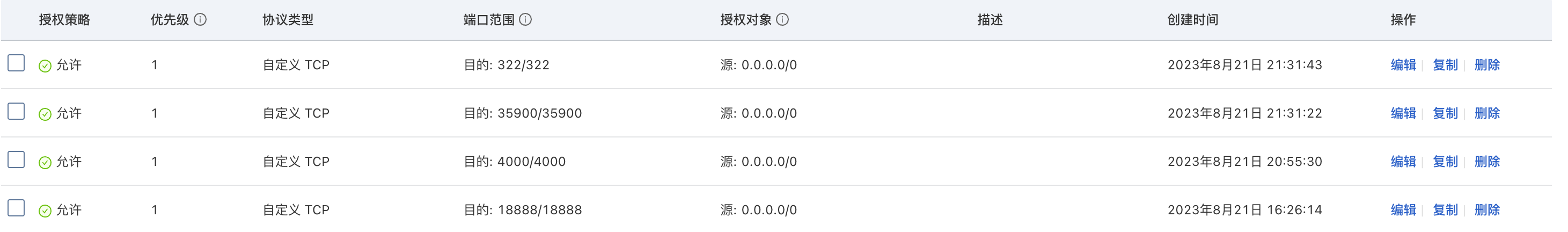 若公网服务器是在阿里云、百度云等云服务器上的,则需要在安全组中为frp开通指定的端口号,如:7000是frp服务默认端口号、7500是在frps.ini配置文件中指定的dashboard_port、其他的则是需要映射到内网服务器的端口