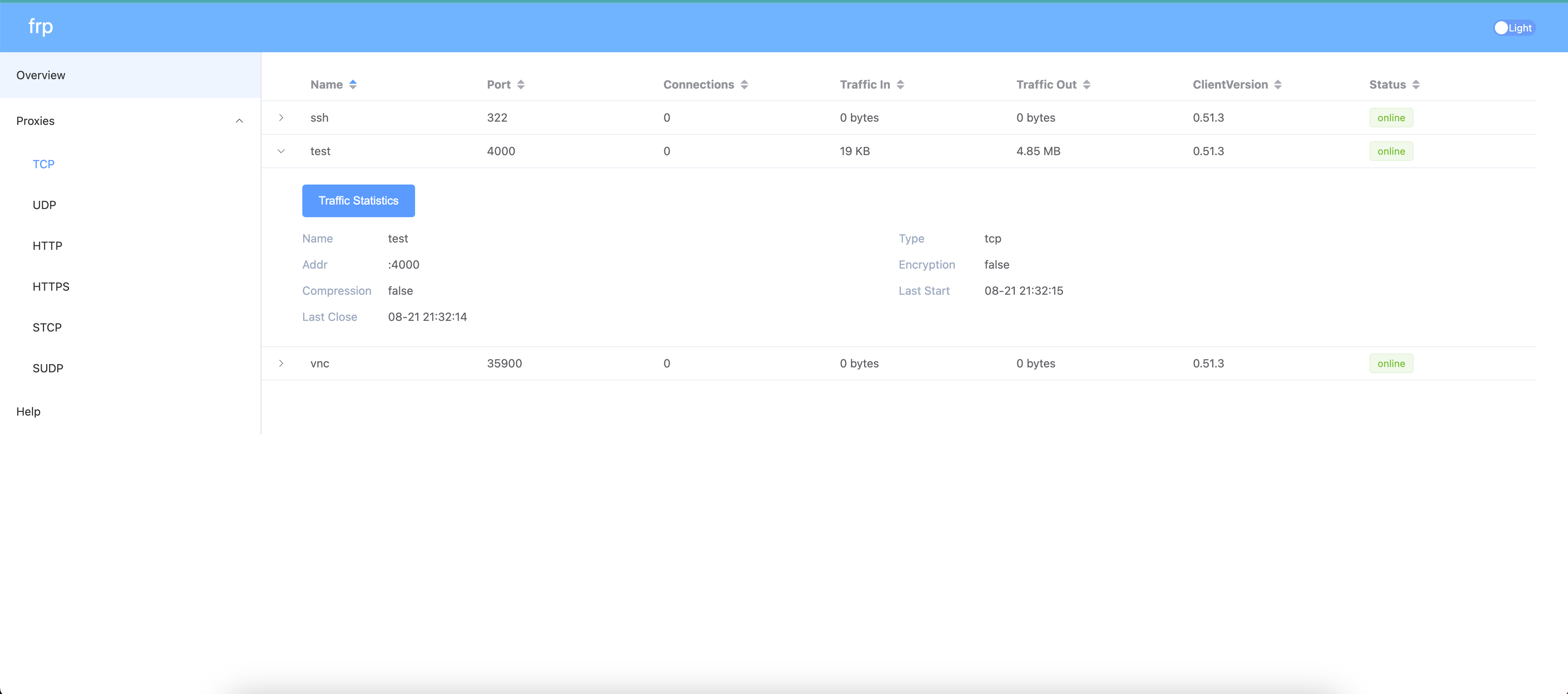 客户端启动成功,通过代理访问后,可以看到dashboard的Proxies-TCP中记录了连接信息:
