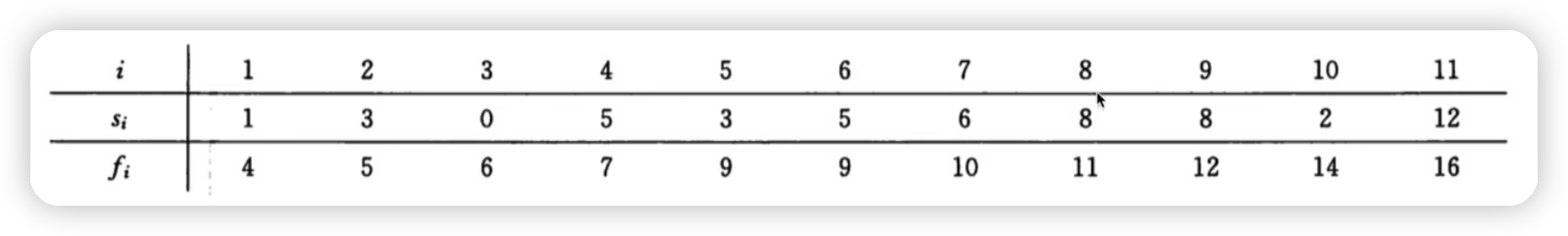activities = [(1, 4), (3, 5), (0, 6), (5, 7), (3, 9), (5, 9), (6, 10), (8, 11), (8, 12), (2, 14), (12, 16)]