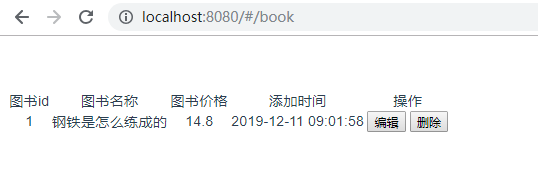 <template> <div id='book'> <table> <tr> <td>图书id</td> <td>图书名称</td> <td>图书价格</td> <td>添加时间</td> <td>操作</td> </tr> <tr v-for="i in books"> <td></td> <td></td> <td></td> <td></td> <td> <button>编辑</button> <button>删除</button> </td> </tr> </table> </div> </template> <script> export default { name:'book', data() { return { books:[] } }, mounted(){ this.axios({ url:'/api/app02/book/', method:'get' }).then(res=>{ this.books = res.data.data; }) } } </script>显示结果