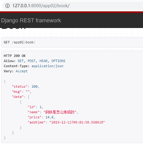 from rest_framework.views import APIView from rest_framework.response import Response from . import models # 书籍 class BookView(APIView): # 获取图书相关信息 def get(self,request): books = models.Book.objects.all() data =[{"id":i.id,"name":i.name,"price":i.price,"addtime":i.addtime.strftime('%Y-%m-%d %H:%M:%S')} for i in books] # 返回数据 return Response({ "status":200, "msg":"", "data":data })获取的数据结构