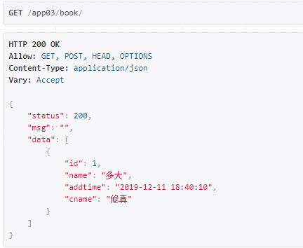 from rest_framework.views import APIView from rest_framework.response import Response from . import models # 图书 class BookView(APIView): # 获取书籍 def get(self,request): books = models.Book.objects.all() data = [{"id":i.id,"name":i.name,"addtime":i.addtime.strftime('%Y-%m-%d %H:%M:%S'),"cname":i.cate.name} for i in books] return Response({ "status":200, "msg":"", "data":data })效果