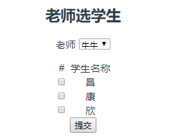 <template> <div id='teacher'> <h2>老师选学生</h2> <p> 老师 <select v-model="tid"> <option v-for='i in teachers' :value="i.id"></option> </select> </p> <table class="tabx"> <tr> <td>#</td> <td>学生名称</td> </tr> <tr v-for='i in students'> <td><input type='checkbox' :value='i.id' v-model="student_id"></td> <td></td> </tr> </table> <button @click="sub">提交</button> </div> </template> <script> export default { name:'teacher', data() { return { tid:0, teachers:[], value:"0", students:[], student_id:[] } }, mounted(){ // 获取所有的老师 this.axios({ url:'/api/app05/teacher/', method:'get' }).then(res=>{ this.teachers = res.data.data.teachers; this.students = res.data.data.students; }) }, methods:{ sub:function(){ let data = { "id":this.tid, 'student_id':this.student_id } this.axios({ url:'/api/app05/teacher/', method:'post', data:data }).then(res=>{ if(res.data.status==200){ // 业务逻辑处理 }else{ alert(res.data.msg); } }) } } } </script> <style scoped> .tabx{ margin:0 auto; } </style>