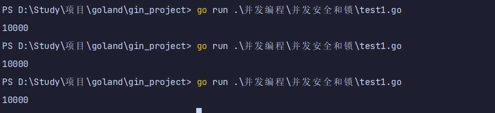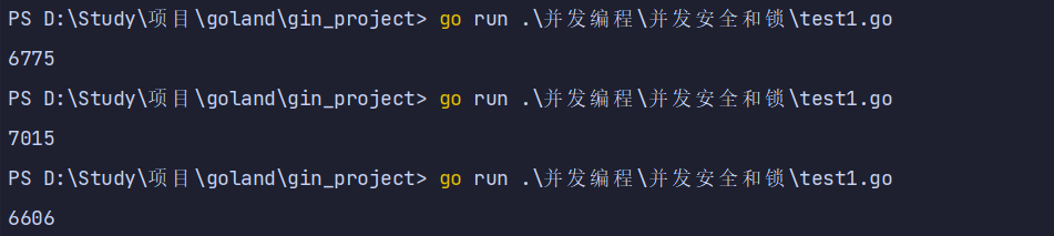 - 下面开启两个协程,对变量x加一操作,分别加5000次,理想结果是10000,实际三次结果都不相同