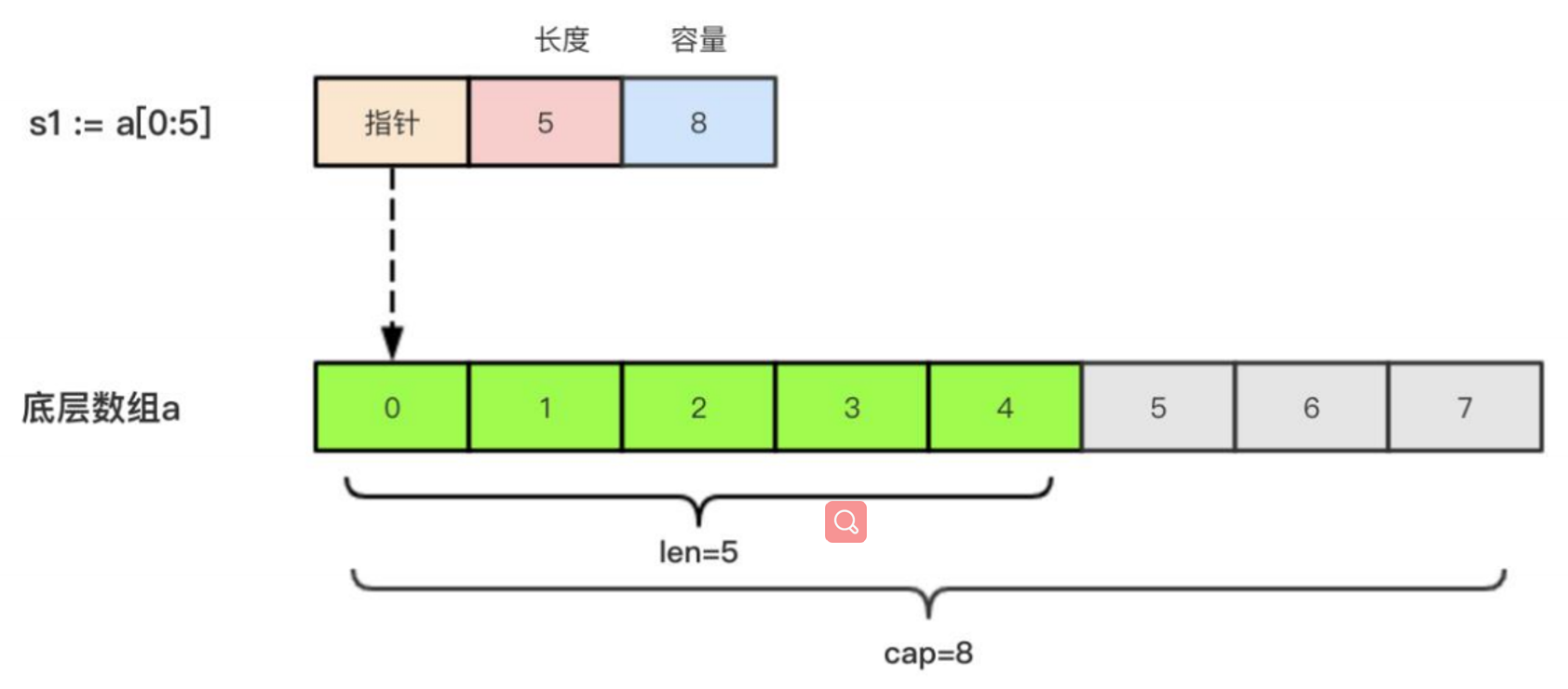 举个例子,现在有一个数组 a := [8]int{0, 1, 2, 3, 4, 5, 6, 7},切片 s1 := a[:5],相应示意图如下。