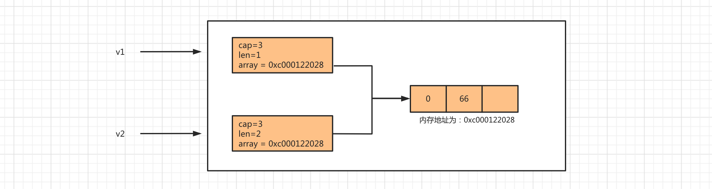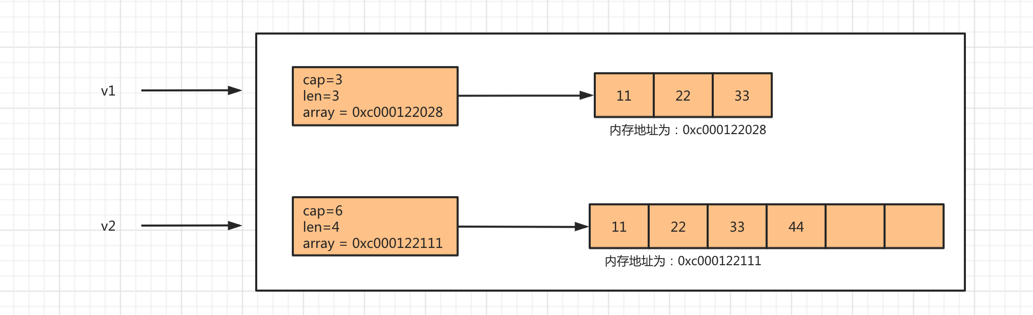 package main import "fmt" func main() { v1 := []int{6, 9} v2 := v1 fmt.Println(v1, v2) // [6 9] [6 9] fmt.Printf("v1的内存地址:%p \n", &v1) // 0xc0000a6020 fmt.Printf("v2的内存地址:%p \n", &v2) // 0xc0000a6040 v1[0] = 11111 fmt.Println(v1, v2) // [11111 9] [11111 9] }如果扩容,那么内部存储数据的数组就会重新开辟区域。
