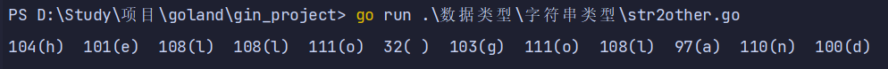 fmt.Printf("%v(%c) ", s[i], s[i])