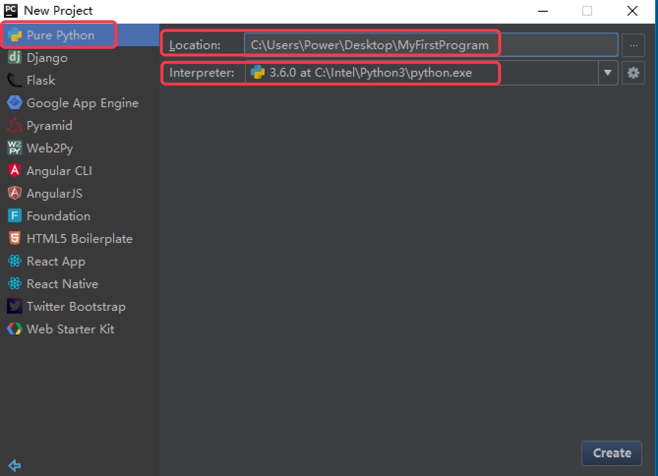 选择Pure Python表示创建一个纯Python程序项目, Location 表示该项目保存的路径,Interpreter 表示使用的Python解释器版本,最后点击Create 创建项目。