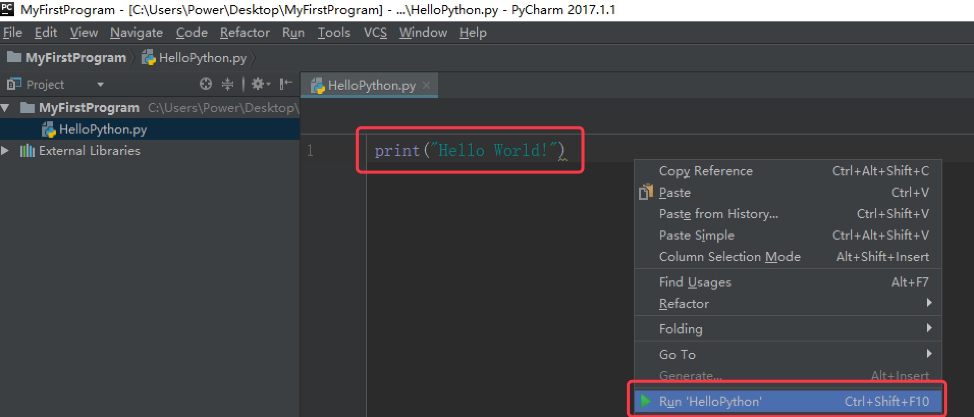 输入以下代码,并右击空白处,选择Run运行,表示打印一个字符串"Hello World!"。