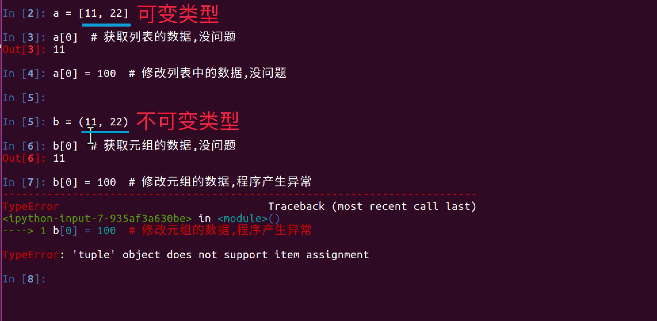 不可变类型有: 数字、字符串、元组