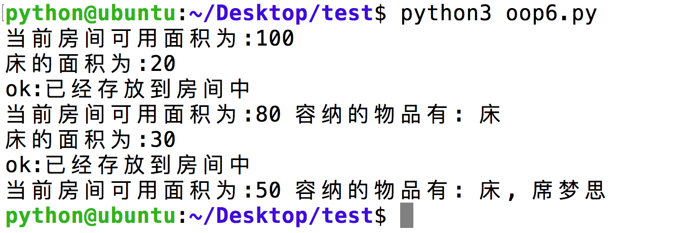 else: print("err:房间可用面积为:%d,但是当前要存放的物品需要的面积为%d"%(self.area, needArea))