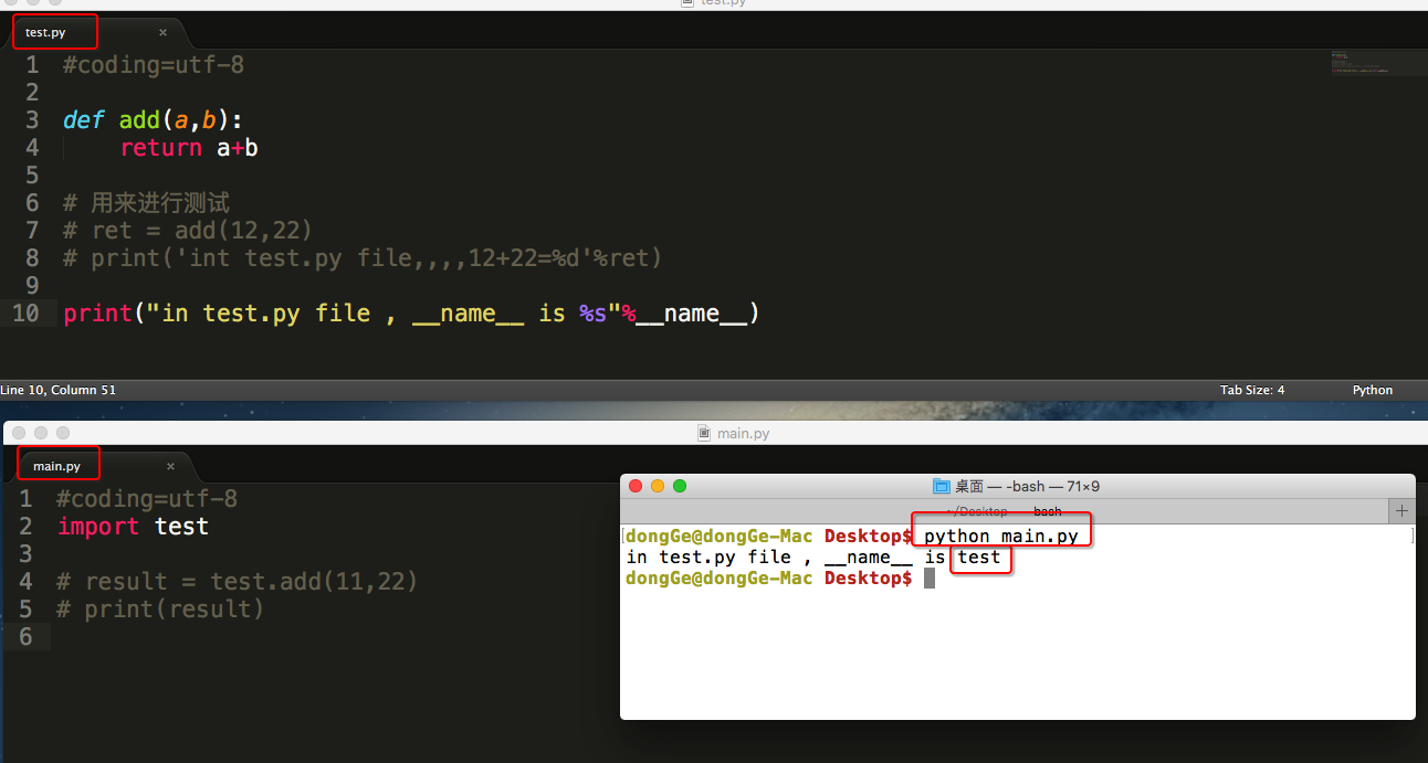 - 可以根据name变量的结果能够判断出,是直接执行的python脚本还是被引入执行的,从而能够有选择性的执行测试代码